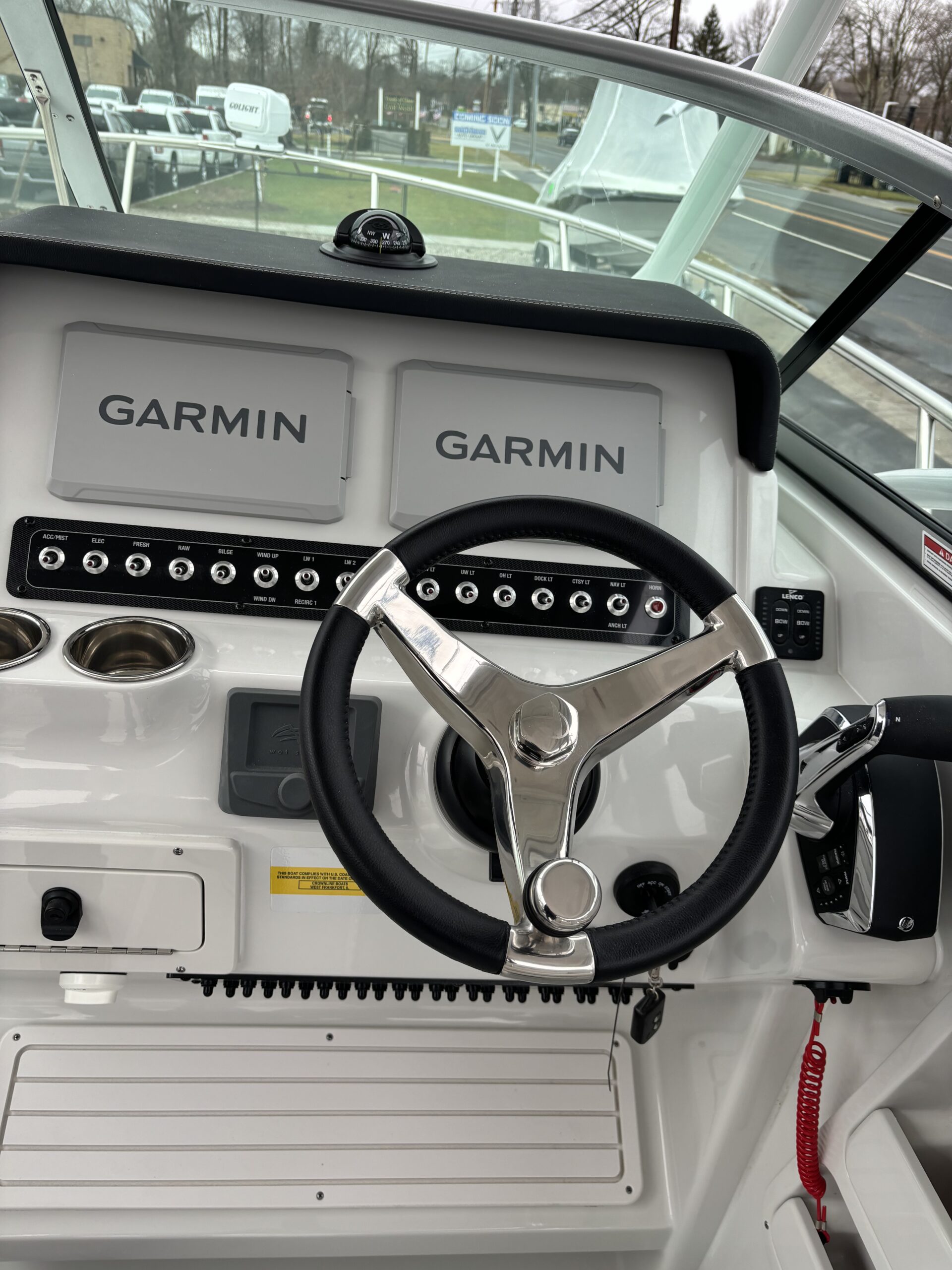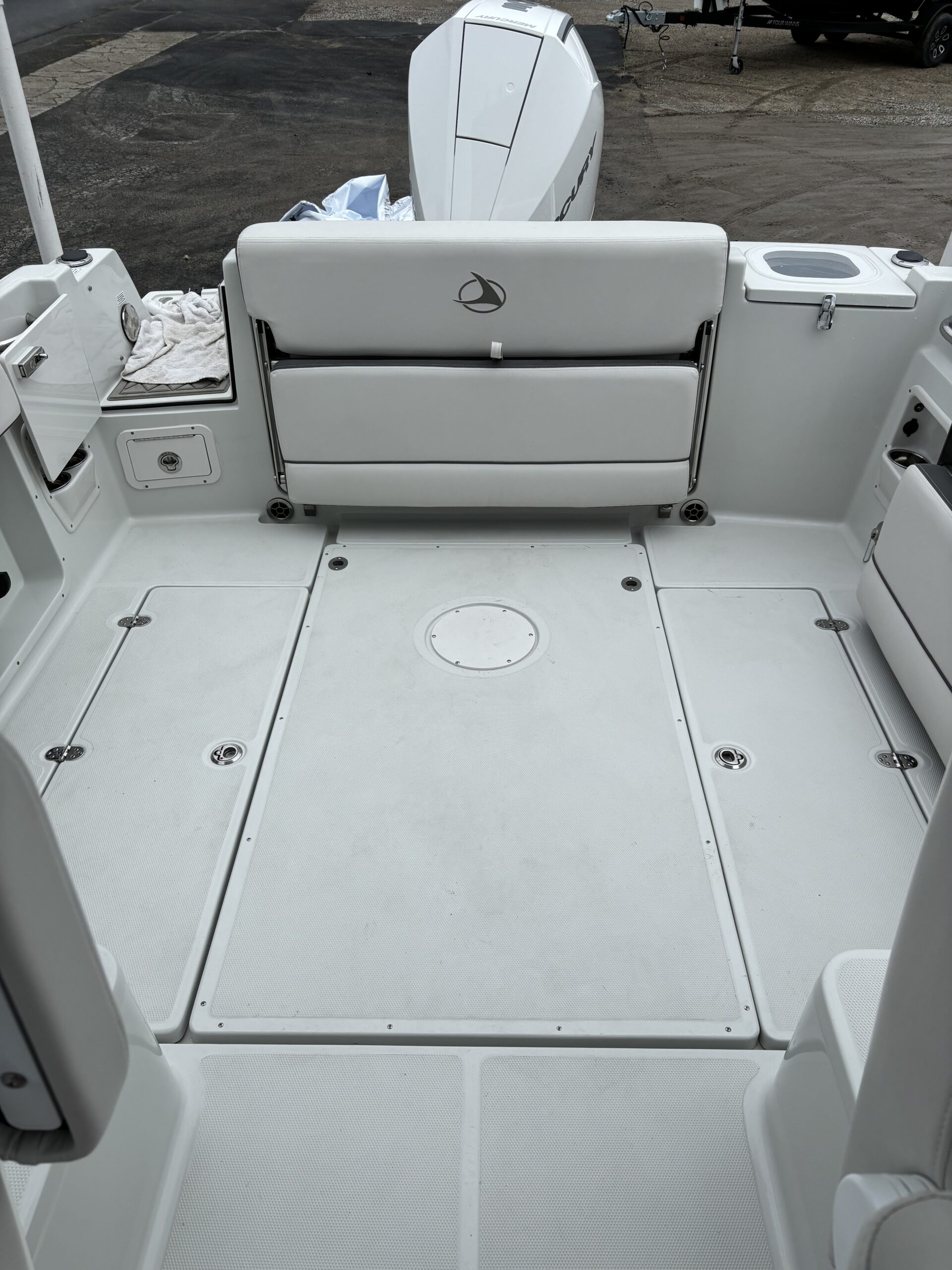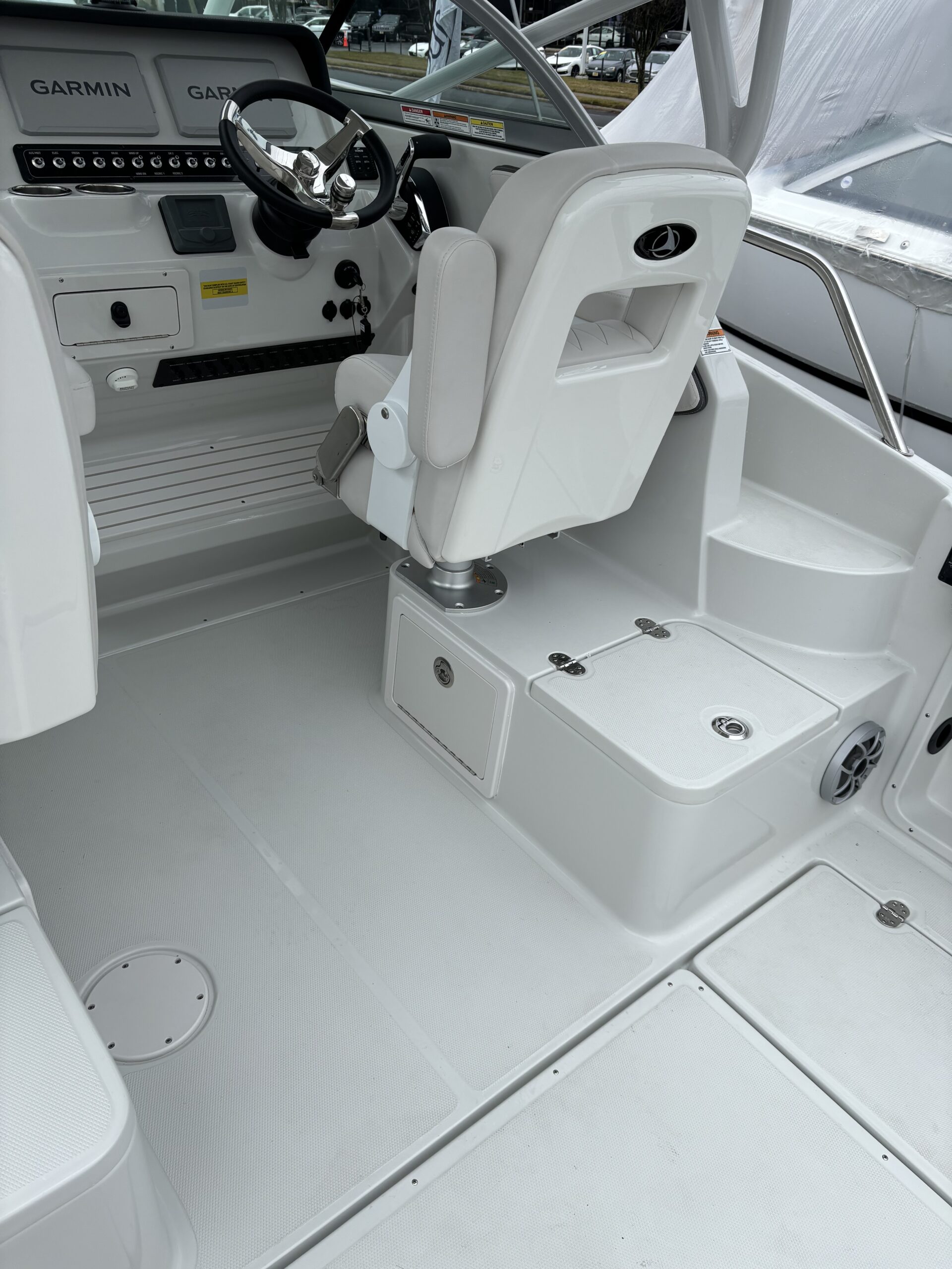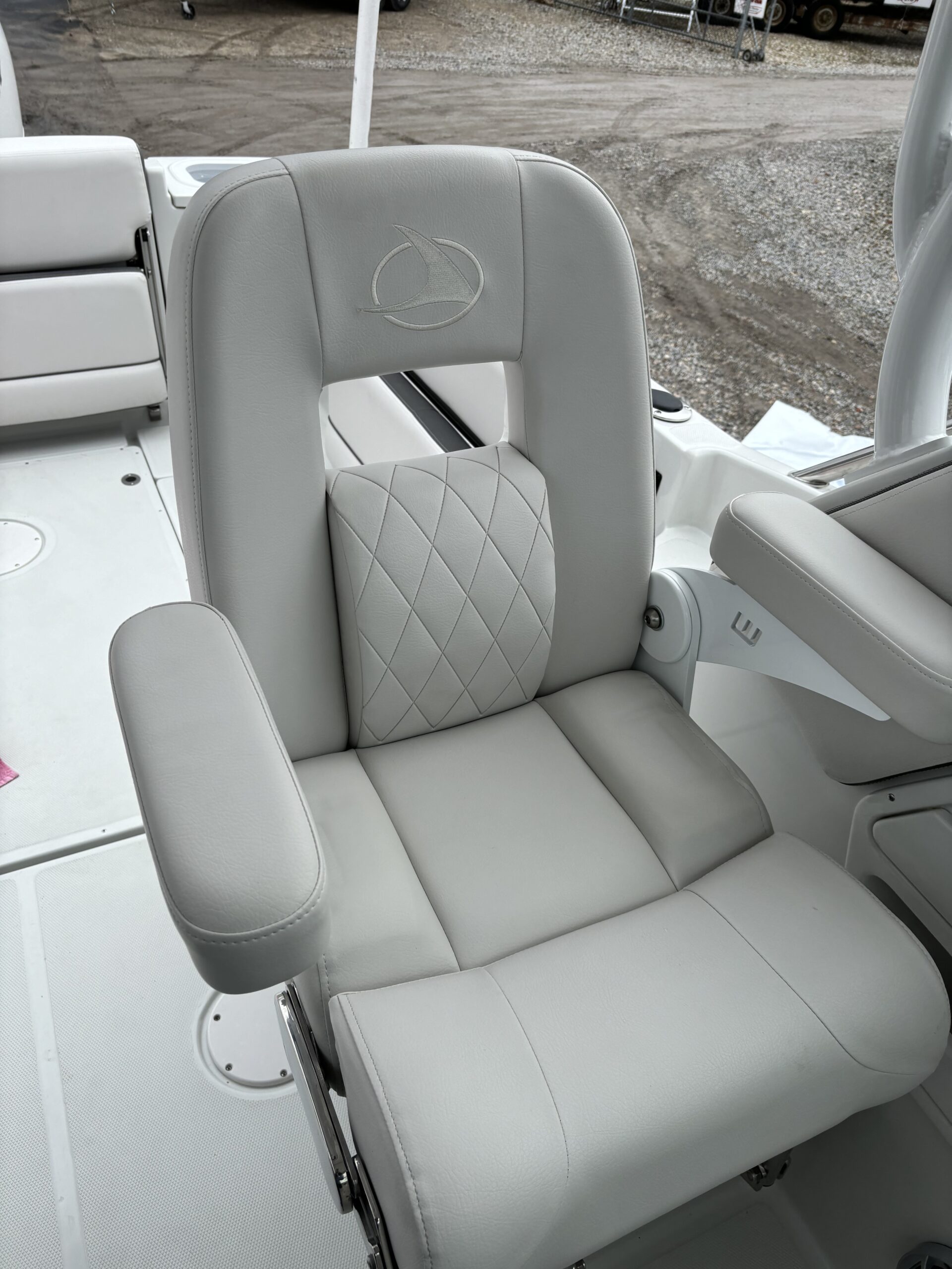 REAR FACING WORK LIGHT, 4 ROD HOLDERS, & WALK AROUND GRAB RAILS COLOR COORDINATED (SLATE) FULL CANVAS w/SIDE & AFT CURTAINS COLOR COORDINATED COCKPIT COVER CANVAS • ELECTRIC FLUSH HEAD W/HOLDING TANK LED UNDERWATER TRANSOM LIGHT PKG & KEYCHAIN REMOTE FOR COURTESY LIGHTS SHOREPOWER: UPPER GALLEY w/M-WAVE, 4 BANK BATT CHRG & GFI OUTLET SOLID S/STEEL STEERING WHEEL w/SPINNER HANDLE • TRIM TABS w/INDICATORS