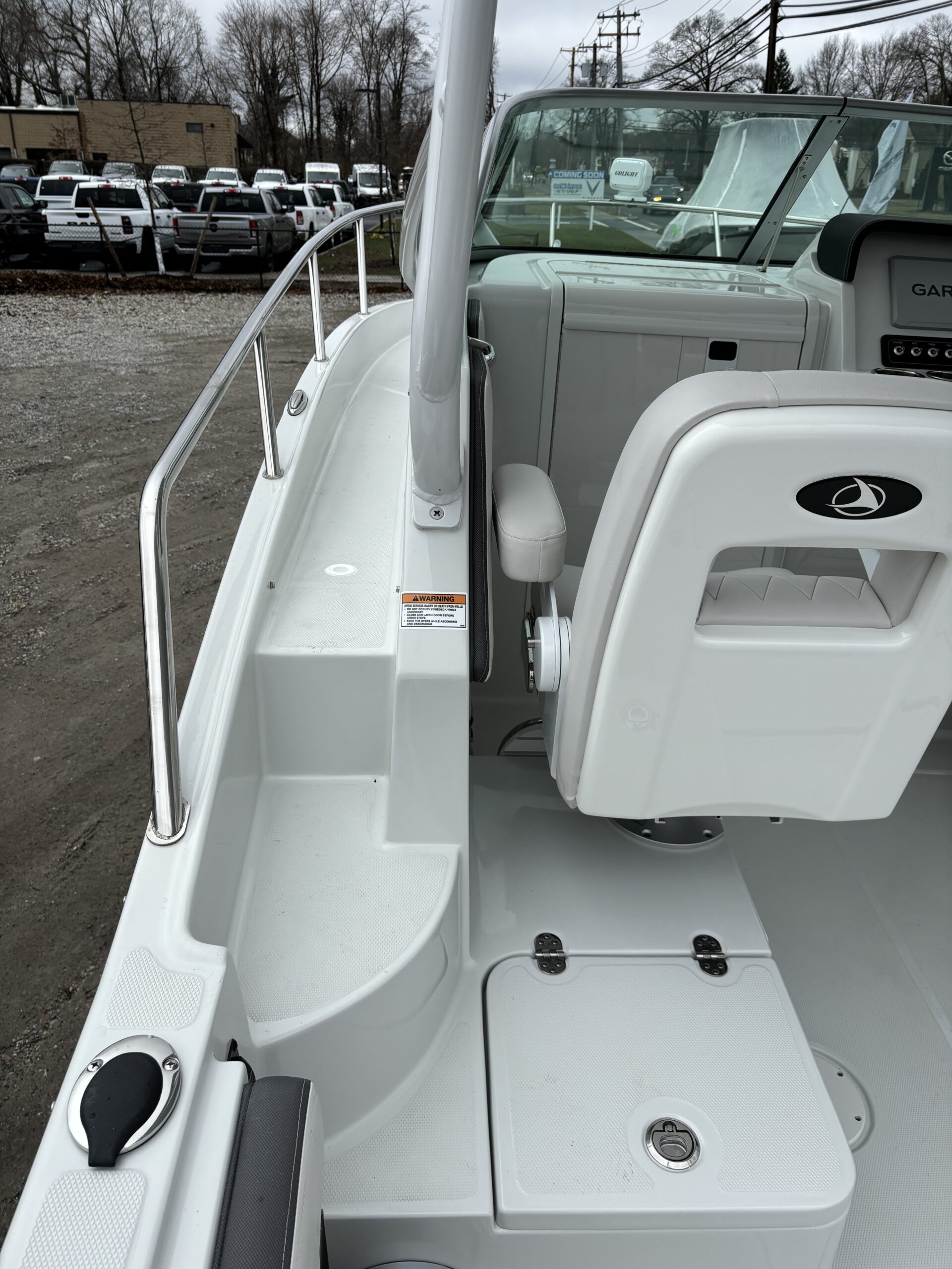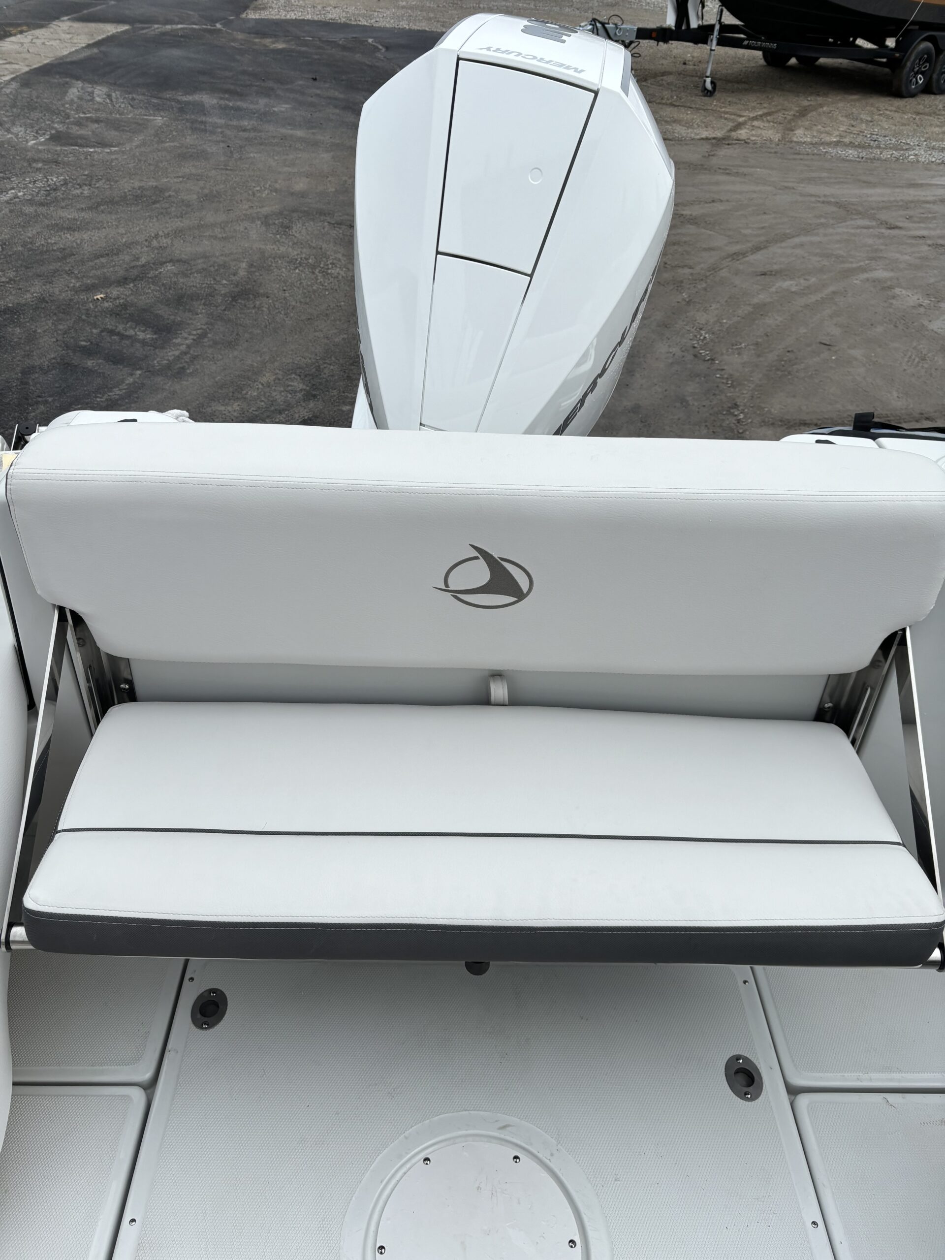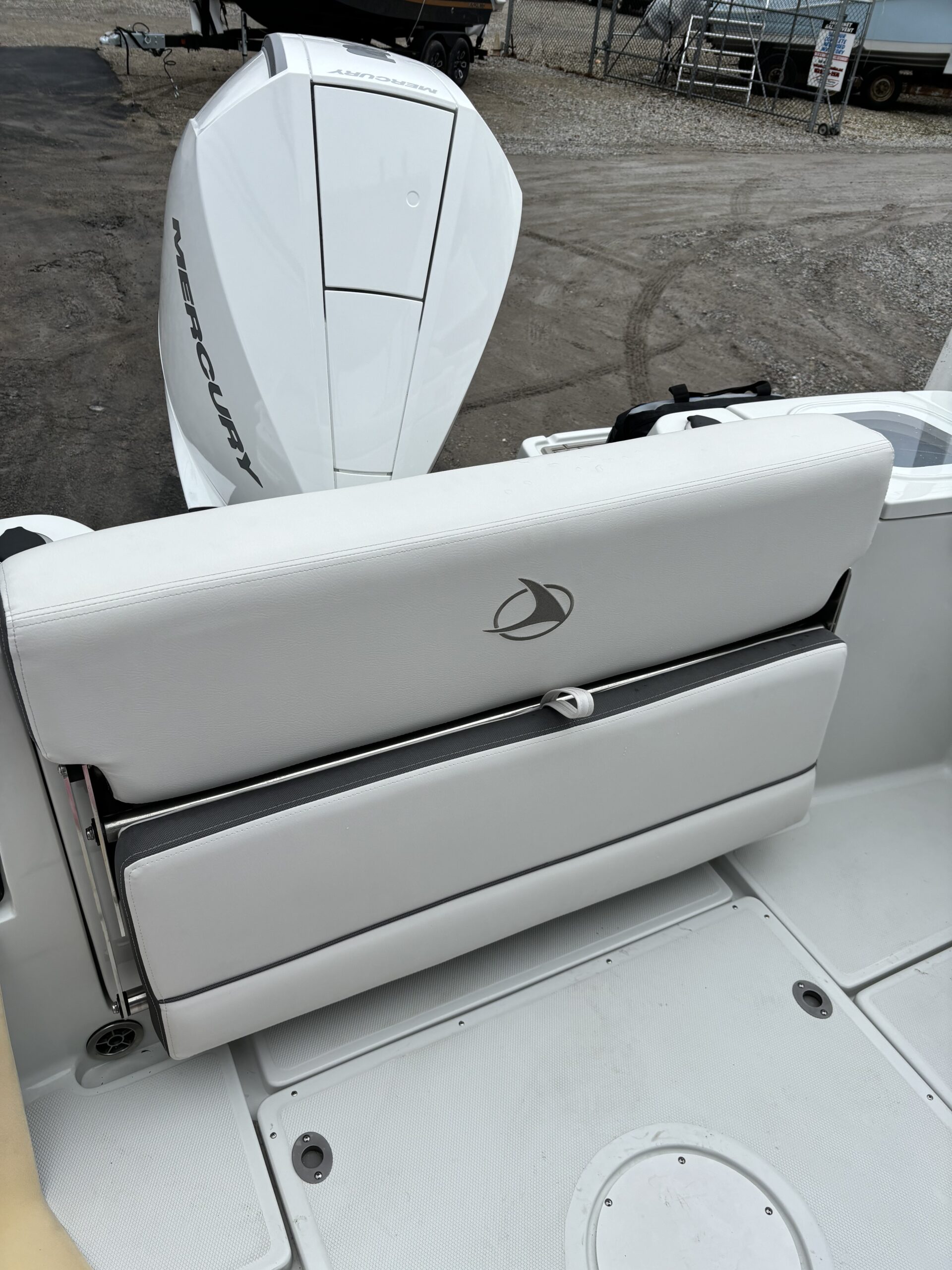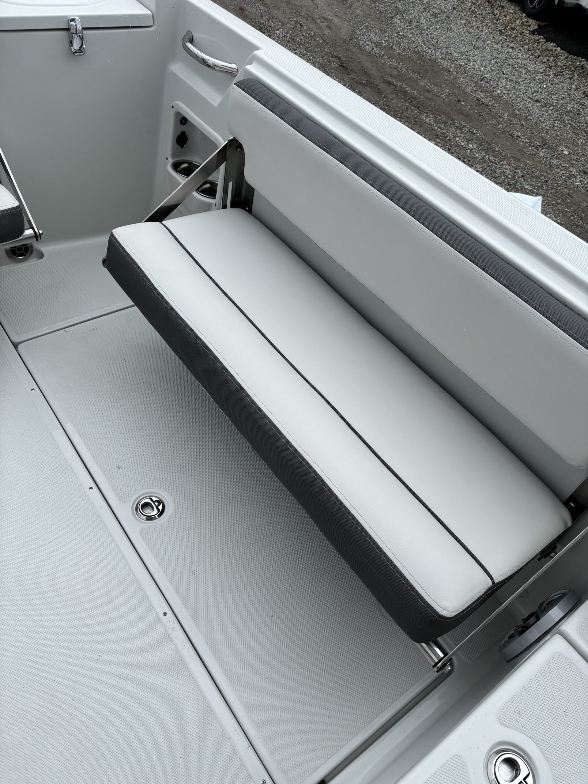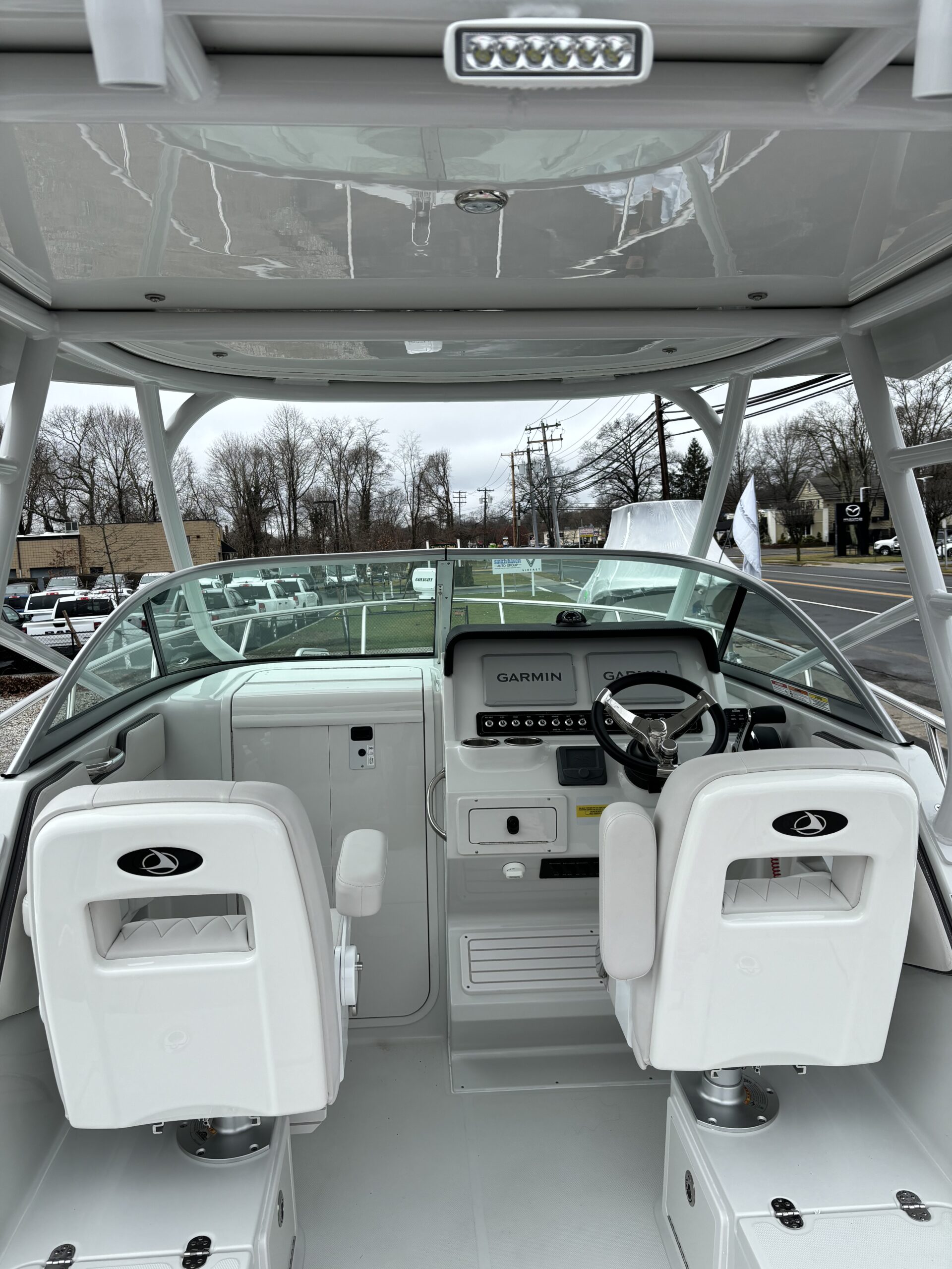 REAR FACING WORK LIGHT, 4 ROD HOLDERS, & WALK AROUND GRAB RAILS COLOR COORDINATED (SLATE) FULL CANVAS w/SIDE & AFT CURTAINS COLOR COORDINATED COCKPIT COVER CANVAS • ELECTRIC FLUSH HEAD W/HOLDING TANK LED UNDERWATER TRANSOM LIGHT PKG & KEYCHAIN REMOTE FOR COURTESY LIGHTS SHOREPOWER: UPPER GALLEY w/M-WAVE, 4 BANK BATT CHRG & GFI OUTLET SOLID S/STEEL STEERING WHEEL w/SPINNER HANDLE • TRIM TABS w/INDICATORS