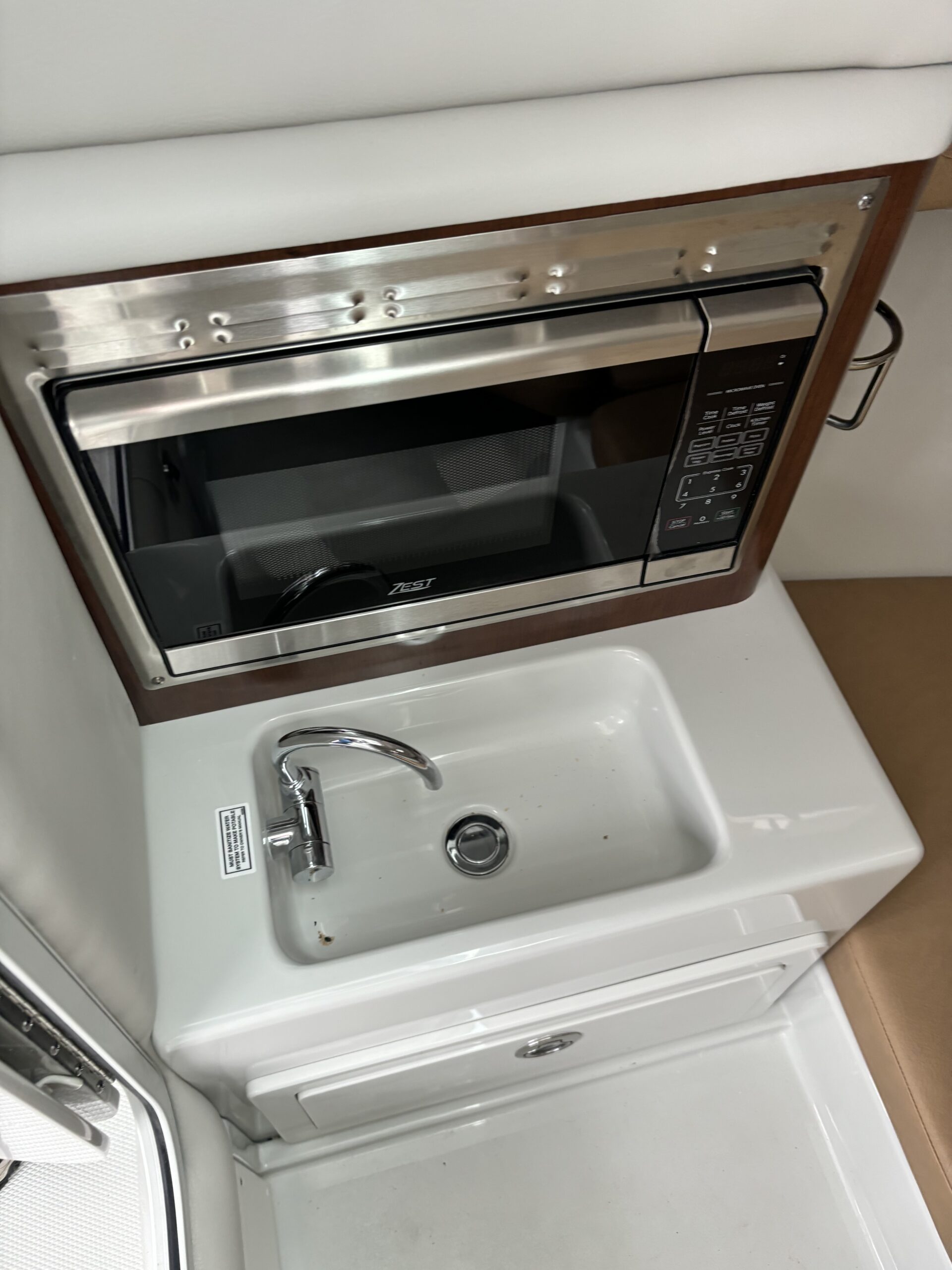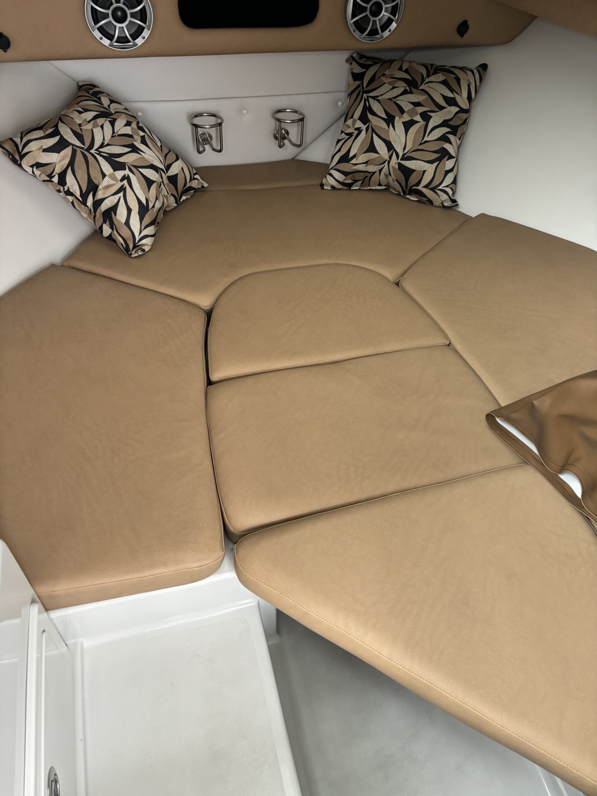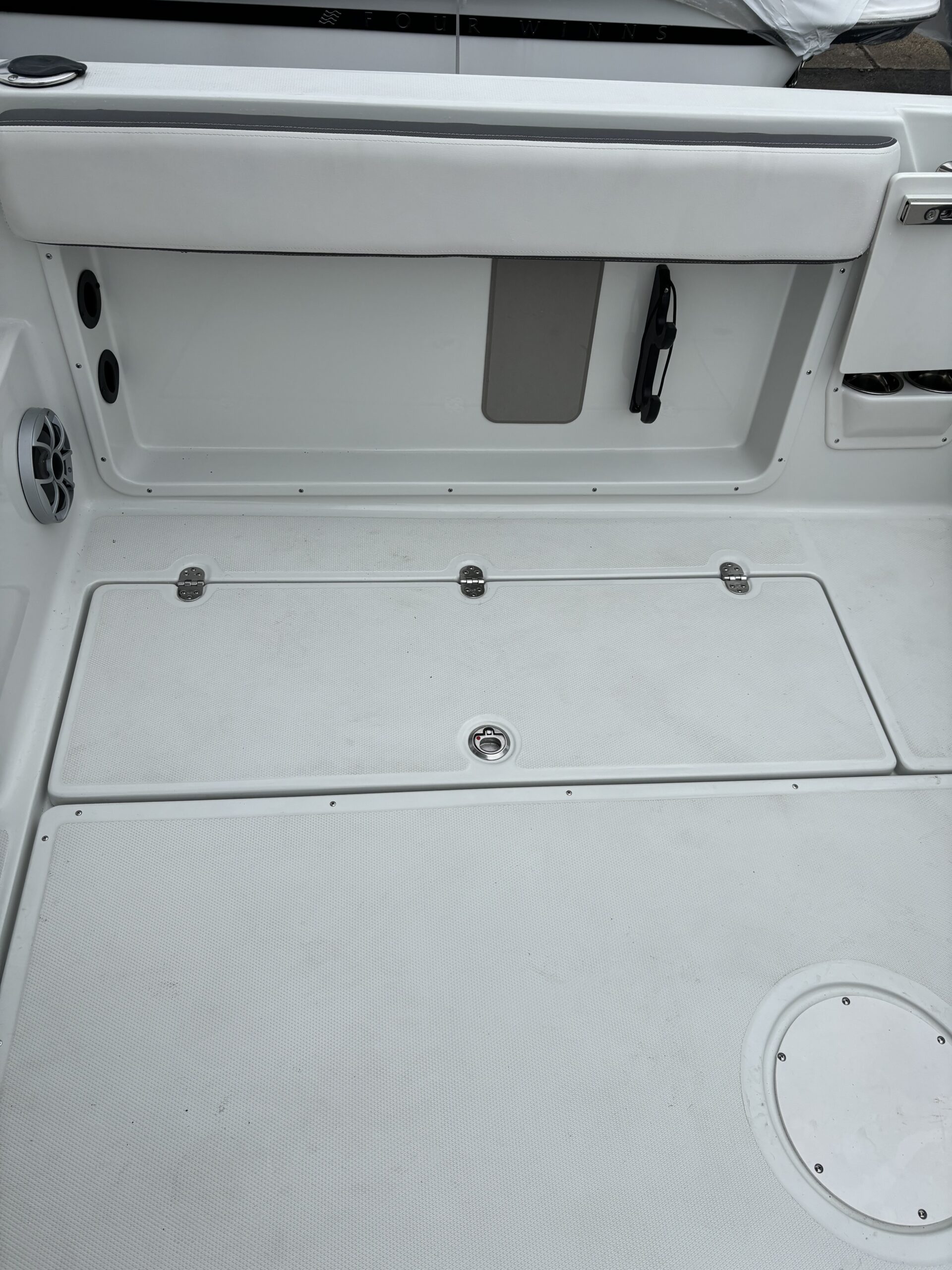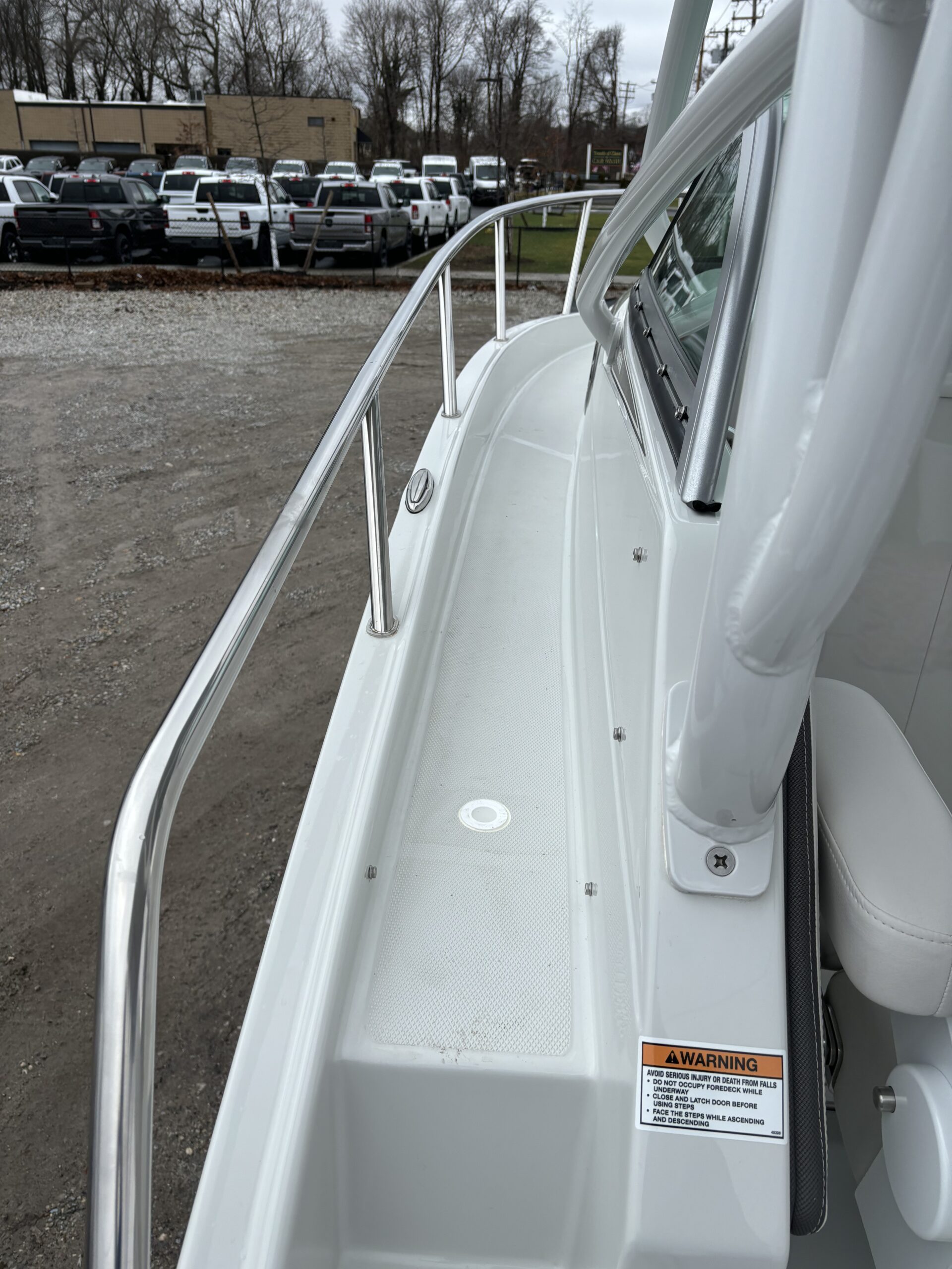 REAR FACING WORK LIGHT, 4 ROD HOLDERS, & WALK AROUND GRAB RAILS COLOR COORDINATED (SLATE) FULL CANVAS w/SIDE & AFT CURTAINS COLOR COORDINATED COCKPIT COVER CANVAS • ELECTRIC FLUSH HEAD W/HOLDING TANK LED UNDERWATER TRANSOM LIGHT PKG & KEYCHAIN REMOTE FOR COURTESY LIGHTS SHOREPOWER: UPPER GALLEY w/M-WAVE, 4 BANK BATT CHRG & GFI OUTLET SOLID S/STEEL STEERING WHEEL w/SPINNER HANDLE • TRIM TABS w/INDICATORS